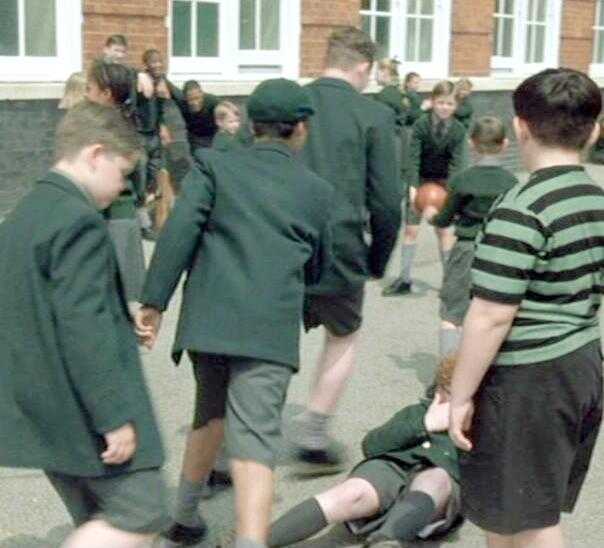Figure 2.-- "Thunderpants" shows the typical English school uniform of blazer and shorts. Many of the boys wear the extremnely long, baggy shorts now worn bu boys. This helps date the production. It is based around a primary school age group, although, some of the students look old enough to be in high school. |