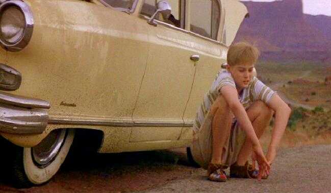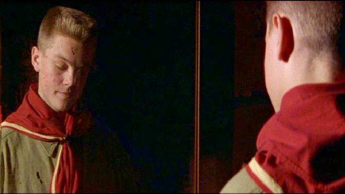 very accurately reflect the period. Toby mostly wears contemprary teen clothes. Here we see Toby on the trip west when his mother's car has broken down (figure 1). The date is 1957. Toby at 13 wears a striped tee-shirt, tan cotton shorts, and sneakers. There are some shots in Scout uniforms. The film had a few scenes with Leonardo Di Capprio and Robert De Niro in scout uniforms, though scouting was only a very minor subtheme in this film. The uniform appears to be an actual Scout uniform rather than the made up-organization often used. In Concrete, Washington, Toby's step-father insists on his joining the Boy Scouts but is too cheap to buy his stepson a properly fitting uniform. At first we see the boy forced to wear a uniform that is too big for him, although he eventually gets a uniform with long pants that fit to replace the uniform with shorts that is too large for him. Strangely these long shorts look to be in style with modern viewers, but a boy in the 1950s swould have never worn such redicvulously long shorts. In one shot he is admiring himself in the mirror (click on figure 1). We also see Toby dressed up in a blue suit at a local prep school where he is taking a SAT exam in the hope of being admitted to an Ivy League college (figure 2).