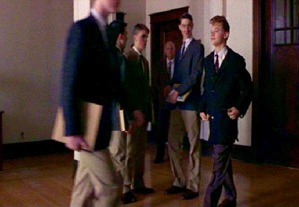 Figure 2.-- We also see Toby dressed up in a blue suit at a local prep school where he is taking a SAT exam in the hope of being admitted to an Ivy League college. |