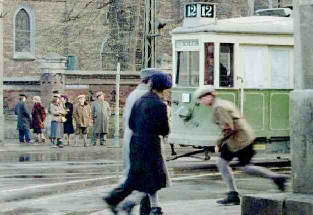 Figure 2.--This street scene of Warsaw in the mid-1940s showing people waiting for the tram and a boy running to cross the street. The picture shows two adolescent boys--teenagers--dressed accurately for the period. The boy waiting with the other passengers in the background wears a flat cap, a light brown jacket that comes down over his hips, brown knickers, and grey long stockings with hightop shoes. The other boy in the foreground wears a flat grey cap, a brown jacket, dark short pants, grey long stockings, and hightop shoes. The location is outside the Warsaw ghetto. Notice the church in the background. |