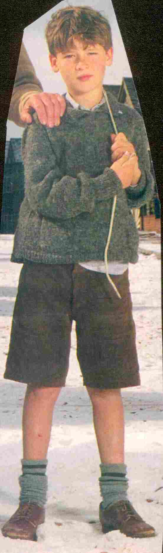 English boys' clothing until after World War II was relativly destinctive and thus British films can often be idntified by the costuming. England has an especially important film industry. We are familiar with English films, but not nearly as so with American movies. As a result there are several scenes from English movies that we can not identify. The boy here looks to have been in an English film set in the World War II period (figure 1). He looks like he may be an evavuee. It looks to have been a relatively recent film, but we are not familiar with it. One British reader writes, "I've a feeling this image is from "Hope and Glory", the boy looks very much like Sebastian Rice Edwards." SAnother reader writes, "I can confirmm that the image here is from of "Hope and Glory". I recall one scene, which was filmed in winter and if you look cloely you will see a snow covered street." Another HBC reader writes, "This English scene is from "Hope and Glory", as the other reader stated and that is Sebastian Rice-Edwards. Interesting how the short trousers in this film set in the 1940s are very similar to to the length that boys wear now."