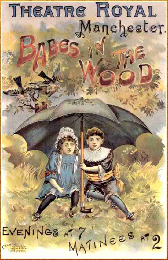 "Babes in the Woods" is a traditional children's folk tale about two children abandoned in a forrest. There are many inantations of this An English version has them die and are covered with leaves by robins. The first published version was a ballad by Thomas Millington from Norwich, England. The basic story has been told with varying details. Many attributeit as a Mother Goose rhyme. Perhaps the best known published version id the Grim Brithers' "Hansel and Grettle. Walt Disney popularized the story with a animated patiche picking up on "Hansel and Gretel" with the addition of friendly elves and of course the required Disney happy ending (1932). We mention this title here because in England nd English colonies like Australia, the basic story is used as a setting for pantomimes. We note these pantamines in England during the 19th and 20th centuries.