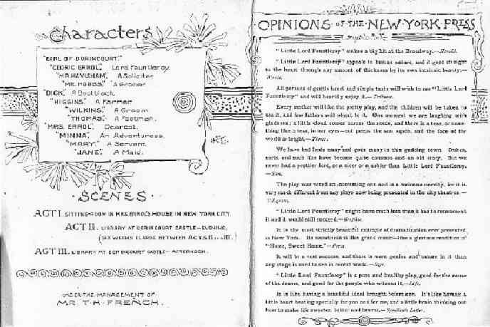 The scenes were: Act I. Setting--Room in Mrs. Erols house in New York City. Act II. Library at Dorincourt Castle--Evening. Six weeks elapse between Acts II an III.) Act III. Library at Dorincourt Castle--Afternoon.