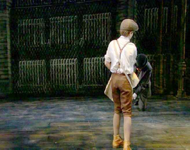 Maggie Lacey. Joe Crowell, the Grovers Corners paper boy, delivers his papers. He wears brown knickers with suspenders and long tan stockings and tan hightop shoes. He also wears a flat cap (figure 1). He was later killed in World War I. There is also an encounter between the high school lovers, George and Emily. George wears grey knickers with suspenders and patterned knee socks. He also wears a shirt with a bow tie. Note his longish hair. The costuming here seems a little wrong. At this early date (the action is laid in 1901) the boys would be more likely to wear knee pants with long black stockings or knickers that fastened above the knee. In addition the knickers are very long, almost down to the ankles. We have seen knickers like this worn in Europe after World War II, but they were not worn in the early 20th century. George's patterned knee socks are also long wrong for the hitorical period as is his hair style. The acting, however, in this version is excellent. The actor who plays George looks a little too old for his role.