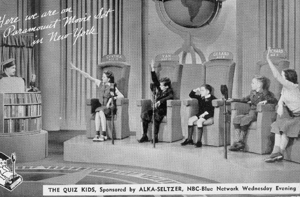 'The Quiz Kids' was a popular radio series that made the transition to television. It was created by Chicago public relations and advertising man Louis G. Cowan. It was originally sponsored by Alka-Seltzer. The program was first broadcast on NBC from Chicago (June 28, 1940). It began as a summer replacement show for 'Alec Templeton Time'. It was a hit anbd continued on radio for the 13 years. It made the transition to television and appeard on both NBC and CBS (1949-53) with Joe Kelly as quizmaster. It was briefly reprised with Clifton Fadiman as host (1956). Kelly asked questions both sent in by listeners and researched by Eliza Hickok and Rachel Stevenson. Kelly frely admitted that he was no intellectual, and that he could not have answered any of the questions without knowing the answer from his flash cards. He proved successful in his role, however, because he was kind and affable with the children. He had an appealing knack for putting the children at ease. The questions were answered by a panel composed of five children, all under 16-years old. The children were chosen for their high IQs, strong academic interests, and appealing personalities, as well as oher attributes including poise, quickness, and sense of humor. One of the first Quiz Kids was 7-year-old nature expert Gerard Darrow, he proved populr because he was one of the younger children. We can see him here, we think in 1941 (figure 1). For the initial premiere panel he was joined by Mary Ann Anderson, Joan Bishop, George Van Dyke Tiers and Charles Schwartz. Other notable participans were