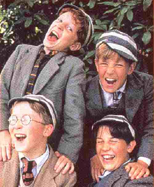 Our English reader provides some interesting insights. One intersting aspect of the "Just William" books is that they are not centered around school, but rather Williams and the Outlaws activities after school. (Here William constrasts sharply with Jennings.) The use of the first name for Willaim and the last name for Jennings reflects this different focus.) Thus we do not learn a great deal about their school. The stories are set in an small rural English village--not the city. HBC does have a small quible with the comments from our English reader. We do not believe that even in the more formal 1920s and 30s that boys would have come home from school and cahnged into clothes kike the ones pictured here for play.