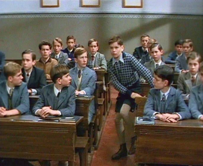 The family believes strongly in education. The Bertinis encourage the boys academically. We see the boys leaving home for primary school on a dark morning and returning home at night with stocking caps to keep their ears warm. The scenes involving primary school occur in 1932-33 just on the threshold of Hitler's seizing power in 1933, but at this point the family is only peripherally aware of the NAZI menace. But when the boys are old enough to go to the gymnasium a couple of years later, it is already 1935, and the Nuremberg laws have gone into effect (September 1935). Each of their three suceed in gaining admission to a good gymnasium (selective secondaty school). Most German children at the time only went to primary school. Children had to do well academically to gain admission to gymnasium or other secondary school, which before World war II were mostly single-gender schools. Just before the boys (shown with their mother in the picture) enter the gymnasium building, they ascend an outdoor staircase and are almost prevented from moving up the stairs by a large group of men in Nazi uniforms with red arm bands who rush down the steps and almost knock them down. The person who a few minutes later interrupts their class is some sort of NAZI official, though he is not in uniform. The two boys entered their gymnasium before the NAZIs seized power. After the NAZIs began to govern, political reliability and not just academic achievemdent became a factor in gaining admission to secondary schools. Applicants would present information about their perforance in the Hitler Youth. And parents had to sign documents affirming their Aryan staztus. Mischiling's would have difficulty gaining admissiin to most schools. University admissiin was almost impossible. It is not clear how the boys managed to get into their gynasium. It may haave been that 1935 was still relatively early in the NAZI era and not all the regulations had been promulgated or the anti-NAZI teachers dismissed from the schools.