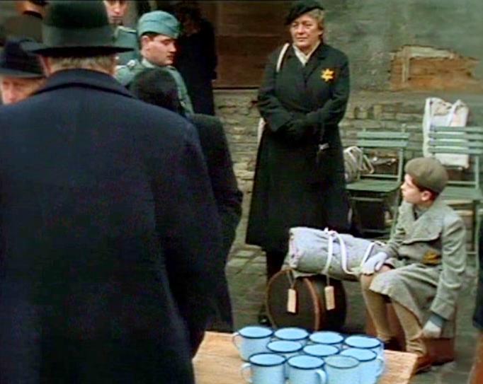 The Holocausrt of course plays a major role in the film, but mostly as a background event. There is a pathetic scene at the railway station where Jewish families are reporting for deportation (figure 1). German Jews were not rounded up as was the case in other countries. They received registered letters in the mail telling them when and where to report and how much luggage they could bring. No one knew their destination. There were rumors about what awaited them, but no one knew for sure. Scholars differ as how much Germans, even German Jews, knew about the fate of the deportees. The Berini boys as Mischlings were not subject to deportation, but their mother was. This may be why the family went into hiding. NAZI authorities did not move aggresively against the spouces of German citizens. The NAZIs did begin arresting a number of Jewish husbands of German women. This gave rise to the Rosenstrasse protest (February-March 1943). This was a non-violent protest in Rosenstrasse conducted outside the building where their husbands were detained. The protestors were the German wives and relatives (mostly women). It was a rare example of public protest in Germany to the Holocaust. Thus while Lea as a Jew was in danger, she probably would not have received a deportation order. Lea's parents as Jews were subject to deportation. There is some indication that Lea's mother protects herself by making secret payments to an older woman who can assist in concealing her Jewish identity. I'm not sure just how this worked.