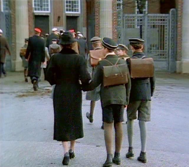 The costuming is excellent and historically precise. The three boys as children during the 1930s wear sweaters, short trousers, and long stockings (brown or gray) obviously supported by garters attached to Leibchen. At night they sleep in long white night shirts. At the gymnasium they wear the same shorts and long stockings but also the peaked caps of their school. At an earlier point, before they enter the higher-level school, they wear stocking caps during the cold weather. When they grow older, Cesar and Roman wear long trousers with suspenders while Ludwig, who is still an older teenager (about 17)