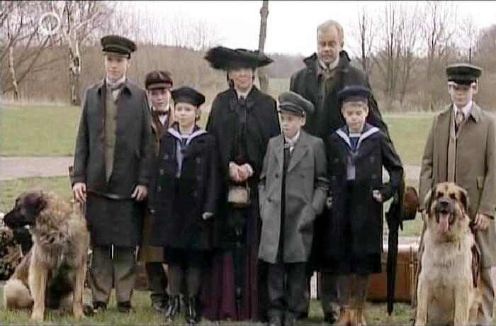 I haven't seen the program and can't fully comment on the accuracy of the costuming. The sailor suits two of the boys wear, however, do not seem quite right. We believe that there would have been a cap tally. More importantly, the way their middy blouses are tucked into their trousers does not look right to us. American boys would have worn blouses without tails to tuck in. Rathers American boys wore blouses that blouced out over the top of their trousers. A drawstring maintained the blousing affect. This is discussed on the blouse construction page. We are less sure about Austrian and Germany boys, but we have noted German boys wearing middky blouses that bloused iver the top of their trousers. One example is an Austrian Budapest family at about the same time. Another good example is an unidentified German family. Some of the other outfits worn by the older boys seem more correct. the older brothers wore dufferent styles of suits. We wonder, however, if all the other boys would have worn long trousers.