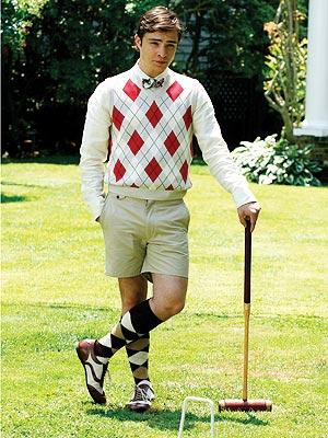 Ed Westwick played the role of Chuck Bass in the TV Series Gossip Girl, an adaptation of the series of paperback novels of the same title. The first of which was published in 2002. Westwick showed up for a lawn party filming sequence in the croquet outfit Bermuda shorts and argyle knee socks. This looked rather like the country club set dressed in the 1950s. This rather elegant image of a teenager dressed for croquet on the lawn of some estate in tan shorts, a red and white arqyle sweater, a bow tie, brown and white argyle knee socks, and sporty brown and white shoes. I expect that at certain country clubs on the east coast or at Long Island estates in the Hamptons, high school a nd college boys from wealthy families might actually have worn such clothes, but in the 1950s. A reader writes, " This is the sort of thing we sometimes see in magazines such as The New Yorker. I used to be invited to croquet parties as a prep school boy, but the dress was quite different of course in the 1940s. However, the designer of this outfit clearly had a certain retro image in his mind." The outfit for some reason was not worn in the actual scene. The episode was titled 'Summer, Kind of Wonderful' and aired during Season 2, Week (September 1, 2008). Westwick was born in 1987 so he was most likely 20 or 21 years old when this was filmed. The characters Chuck Bass and Blair Waldorf (as herself) are in a relationship and throughout the series Chuck and Blair are found in many different (and endearing at times) romantic settings and situations. The time of the setting in the story is not clear, but it could be in the 1990's. I somewhat doubt the croquet outfit was worn in this historical context.