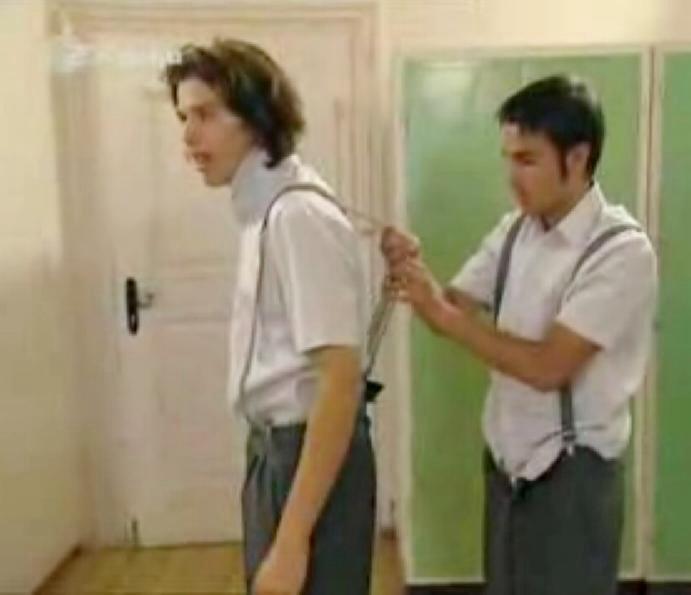 The teenage boys (about 16-17 years old) have to exchange their modern clothes for a school uniform, which consists of grey woolen short trousers held up by clip-on suspenders. They wear white collared