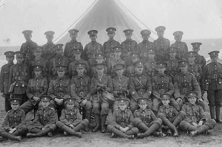 Figure 1.-- Here is a portrait of the boys in the Cadet Officers’ Training Corps of the East Surrey Regiment at Tidworth Park OTC Camp in 1928. Their officer wears the ribbons of the British War and Victory Medals. |