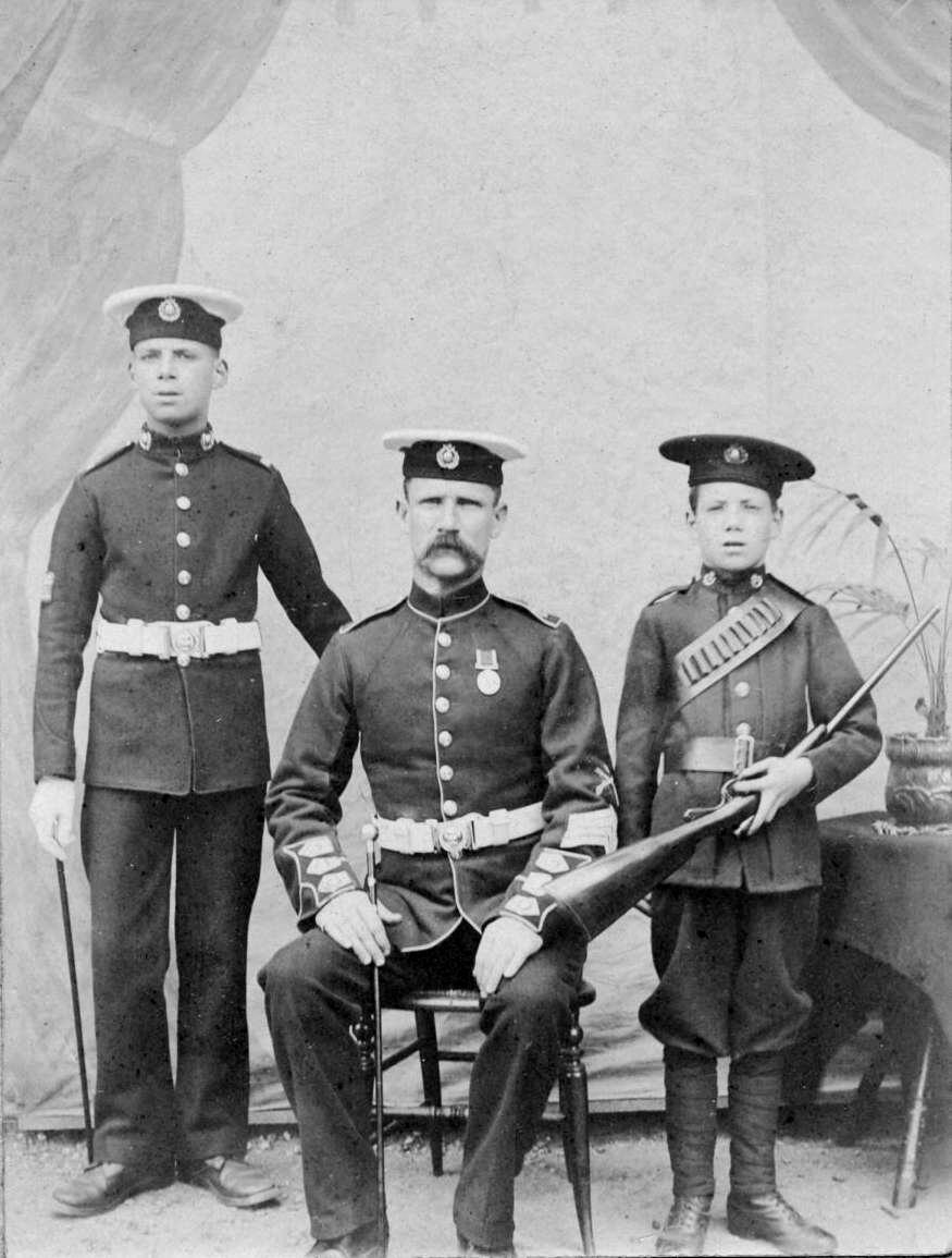 Here we are not sure. The teenager appears to be an officer, perhaps an ensign ir other tyoe of junior oficer. This is suggested by the cap, white gloves, wager stick, and white gloves. Note the officer has a medal. One medal for an officer of his ge seems unlikely. Perhaps this was a particularly oresyigious medal. We do not know where the portrait was taken. There is no studio imprint. The group has a British look to us, but we do not recognize the uniforms. They do noit seem to be either Army or Navy uniforms. We are guessing that they could be the Royal Marines. The portrait is also not dated. The mount suggests the turn-of-the 20th century to us, perhaps about 1900-05. This would have ben the Boer War era.