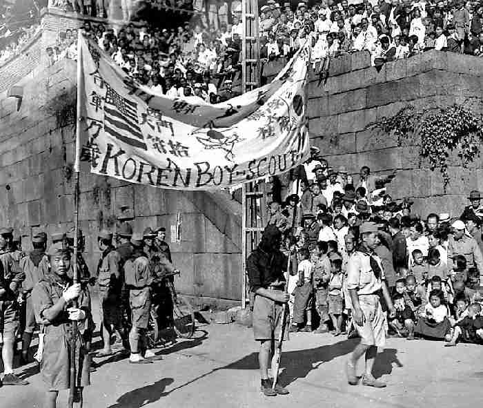 Japan seized control of Korea (1909), after which the country became a Japanese colony. We know relatively little about Korean youth groups. The Scout Movement of Korea (BSKI) was founded in October 1922. Sir Lee Sang-Jae is elected as the first President of the BSKI in March 1924. At the time there were many limitations on Korean Scouts. Korea was a Japanese colony and any demonstration of Korean nationalism was discouraged and dangerous. The Japanese prohibited Scouting in Korea during March 1937 as relations with western Goverments began to deteriorate as the Japanese militarists expanded their expanionist policies in Manchuria and China. Not only were the Japanese concerned about any expression of Korean nationalism, but Scouting' western image and internationalist principles were increasdingly alien to Japan's militant nationalism. Scouting was revived after the Japanese surrender and the American liberation of South Korea. At the same time the Soviet Union liberated North Korea. The Communist Government installed in the north founded the Young Pioneeer movement.