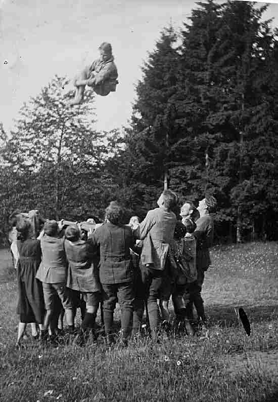 Figure 1.--We have no information on this image except that it was German. It looks to us as if it was tken in the 1910s given the clothes thst the children are wearing. It may have been just a group of local youth. We suspect, however, that it may have been Wandervogel group. The Wandvogel was coeducational and was asociated with hikes and other activities in the countryside. Notice how high they are throwing the boy here in the blanket toss. |