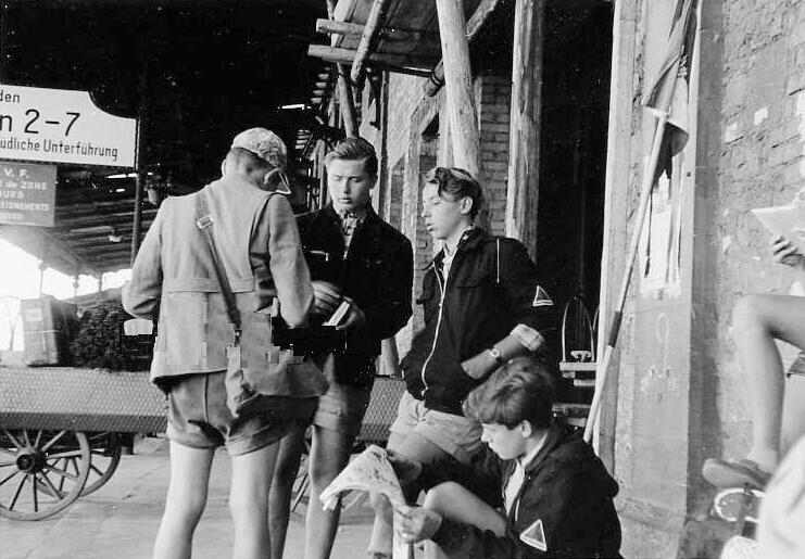 Here we see a group of teenages on an outing, we think in the early 1950s. The boys are waiting for a train at a station platform. A reader tells us, "These boys obviously are at a railroad station. The sign says: ...üdliche Unterführung. That means: "south(ern) underpass". The s of südliche is not visible." We do not know where the snap shot was taken. We think it might be East Germany, but are not sure. Some signs are visible, but they provide no informationn as to the location.