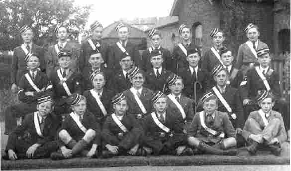 The Boys' Brigade was the earliest boys' uniformed group, being founded in 1883. While the uniform was a basic part of the program from the beginning, the basic approach of the Boy's Brigade to te uniform was to keep it simple and thus inexpensive. This mean that virtually any boy could participate and not just boys from middleclass families. The basic uniform was the pillbox cap used by the British Army, a belt (often but not alwats with a round Boys' Brigade buckle and a shoulder strap), and a haversack. These items were worn over a boys own clothes, generally his best sut. This basic uniform continued to be worn by British Brigaders into the 1960s. We have however seen some Brigaders even before the 1960s in full uniforms, usually the adult leaders.