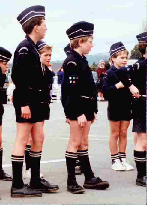 Boys during the first year of the Boys' Brigade (presumably 1883) only wore a rosette as a badge, and the officers wore a detinctly civilian-looking bowler hat. The following year (1884) the cap, belt, and haversack were brought together as the first uniform. The idea was to have a very basic uniform that every boy could afford. The boy bassically wore his on clothes, but added a few in expensive items to give the unit a uniformed look. The pill-box in common use during these days had no chin-strap and fitted close to the head, but it had two distinguished rows of white braid worn at a jaunty angle. Soon afterwards the proper pill-box was brought in and the officers turned to the Glengarry-like campaign cap for their headgear. Afterwards the forage cap, haversack and belt were introduced. Eventually a full uniform was approved. The Boys' Brigade uniforms are much more standard around the world than Scout uniforms which have adopted uniforms incorporating various aspects of national dress. The Boys' Brigade uniforms is generally blue foraging caps, blue shirt, and blue pants. Initially short pants were generally worn, but most groups now wear long pants. Shorts and knee socks are still commonly worn in New Zealand. Many Boys' Brigade units have pipe bands, reflecting the Scotish origins of the organization. The bands generally wear kilts. Regular Scottish Boys' Brigade members have also worn kilts, but HBC is unsure how common this was. We note early Boys' Brigade members from Scotland wearing kilts, but we do not know how common it was.