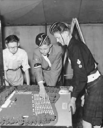 We have very little information about the Dutch Boys' Brigade, but we know that there were Brigade units in the Netherlands. As in Britain, the Brigade had more of a Christian focus and for many years a Protestant focus. The Brigade was founded in the Netherlands during 1935. We know that it was operating in the 1950s. The photograph here is dated August 12, 1954 (figure 1). It was a press photograph entitled, "Camping on Eton's Playing Fields". The caption read, "To mark the centenary of the birth of Sir William Smith, founder of the Boy's Brigade, a 10-day camp, starting today, is being held on the playing field of Eton. 2500 members of the Brigade from all over the world are attending this camp. PHOTOGRAPH SHOWS: (left to right) GEERT BYSMA and JAN REXNTJES, aged 15 and 16 respectively, both of the le Hoogkerke B.B. Group of Holland, studying the model of the camp lay-out with Jim Henderson (17) from the 1st Dunoon Group of Scotland. He is a piper in the Boys Brigade Band, and a Corporal." We do not know the Brigade's current status in the Netherlands.