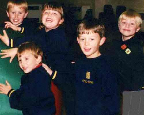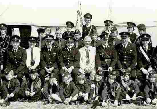 By the 1970s, most boys wore long pants uniforms, but a few members still wore a short pants kit. Boys in the 1960s wear red ties with their blue shirts. I'm not sure when this style was introduced. The kneesocks the boys in shorts wore were blue to match the shirt and shorts with red stripes. Church Lad Brigade boys by the 1990s wear much more informal uniforms than was the case in earlier years. The younger children (Martins) wear blue sweaters wuith yellow trim, a departure from the blue andcred theme. Almost all of the boys wear long pants.