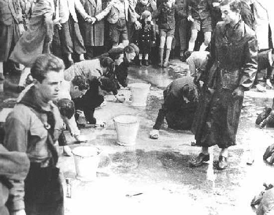 It is unclear to us at this time to what extent Hitler Youth (HJ) boys were used in the various actions asociated with the NAZI anti-semitic campaign. The SA Stromtroopers would physically asault Jews on the street. We are unsure if HJ boys were involved in such activities. We know that even before Jews were expelled from German state schools in 1935, many Jewish children had to leave the schools because of verbal and physical abuse by both teachers and fellow students. To what extent this abuse was random individual acts rather than coordinated acts I do not know. I know of no coordinated HJ national policy. It seems inconceivavable given the intensity of the propaganda and educational campaign that HJ boys did not discuss actions aginst Jewish children in their class or school. To what extent such actions were encouraged or guided by the adult leadership we do not know. There were of course many opportunities for HJ members to participate in ant-semitic campaign. HJ boys could report on Jewish neighbors for violation of the myriad of activities affecting their lives. They might notice, for example, a Jew who entered a movie theater or sat on park bench or who tried to hide property in their back yard. Given all the restrictions on Jews, the possibilities are virtually endless. I am not sure to what extent HJ boys carried out acts of vandalism on property. Here they may have been discouraged by NAZIs officials more concerned with stealing Jewish property than destroying it. There were of course exceptions. We wonder to what extent HJ boys were involved in Crystal Night. We note that HJ boys were involved in the public humiliation inflicted upon Jews after the NAZI Anchluss in 1938 (figure 1).