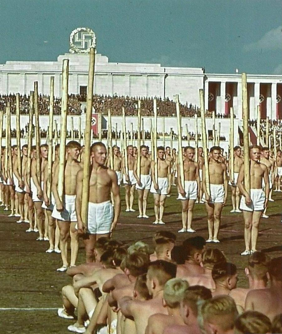 It should not be thought that the HJ emphasis on physical conditioning was limited to just military purposes for the boys and bearing babies for the girls. There was also a strong ideological compnent to the Hitler Youth physical condition effort. The idea of a master race and the superior abilities meant that German youth had to display strongly developed bodies and physical conditioning. Every German youth thus had the resonsbility to care for his or her body as a duty to the nation and Aryan racial community. The idea of the perfect body was represented in NAZI art. There re many examples of this. And we see Strength through Joy mass field exercizes emphasizing the fine physical conditioning of German youth as a result of the Hitler Youth program. In esence one's own body became property of the NAZI state. Hitler explained the concept in his writings, "Thus the entire education has to be directed towards employing the free time of the boy for the useful training