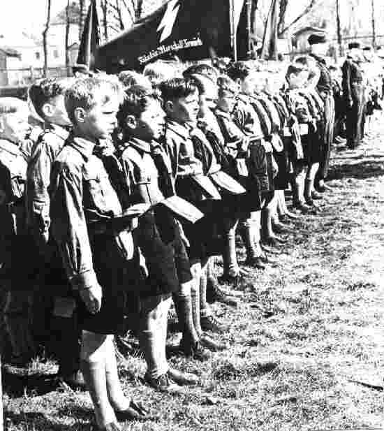 Boys at the age of 10 were conscripted into the Dutsche Jungvolk (DJ. As Jungvolk the boys had to swear an oath, basically saying that they were willing to give up their lives for Germany and Hitler. Membership at 10 was after the NAZIs seized power in 1933 not at first mandatory, but strongly incouraged. Social pressure was put on the boys in a number of ways. Some parents did not approve. Often boys did not understand their parents disapproval. Some boys had enough sence to leep quiet about their parents disapproval. Other boys, after all they were only 10 years old, did not understand what was involved. Eventually membership was made mandatory. The boys wore the brown shirts and black short pants that are so associated with the Hitler Youth.
