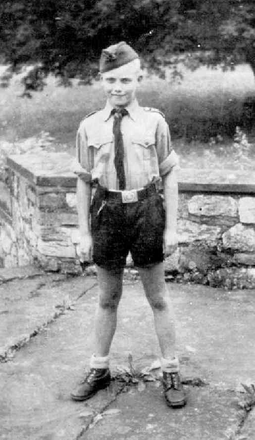 We note several variations in the garments worn by HJ boys. The HJ changed uniforms garments slightly over the years. The most obvious change was in the headwear. There were several other smalkler changes such as in the belt buckle design. We also note fewer boys wearing the leather strap and belt after World SWar II began (September 1939). The most oThere were two sections to the boys units of the Hitler Youth, the Deutsche Jungvolk for the younger (10-14) boys and the Hitler Jugend proper for the older (15-18) boys. There were differences in the uniforms of the two groups. Most of the uniform items were identical. It is difficult to tell the difference between the DJ and HJ boys in the summer uniform, except by the age of the boys involved. Perhaps there was a difference, but we have not yet found what it was. There was a difference in the winter uniform, but we are mot entirely sure it was a manditory difference or just reflected the age of the boys and the way older boys dressed. We see many DJ boys wearing short pants with the winter uniform while the HJ boys seem to wear the long knicler ski pants.