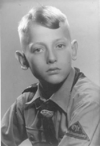 Figure 1.--This DJ boy wears the triangular patch on his left sleeve. The image is not clear enough to see where he was from. The top line, however, does look like "Ost" meaning east. The most notable aspect of the image is a healthy set of ears. His blond hair probably brought him a good core on any racial examination. We wonder how those ears affected any racial assessment. |
