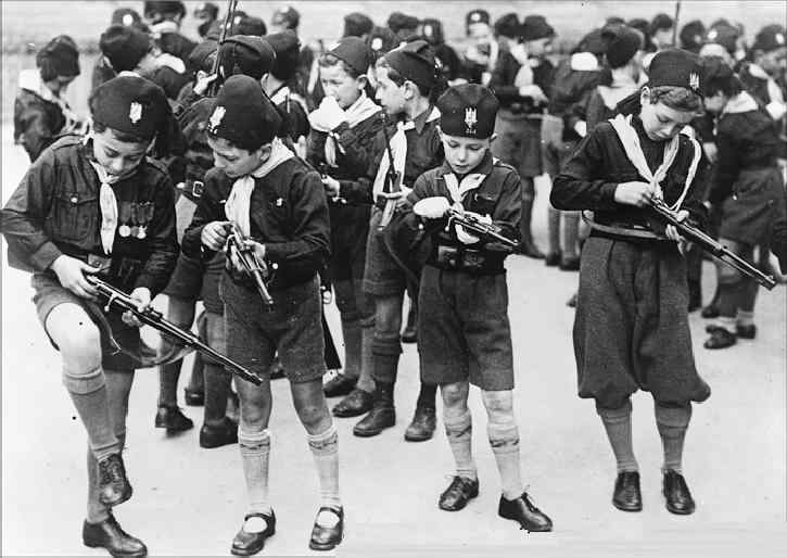 The Bsalilla program included some psra-,ilitary training, but we do not yet have much detail on this. There was some basic para-military training conducted by each unit. We do not have much information on just what was involved. One press photo before the War pictures Balilla boys "studying picture books on military training". We note images on boys handling fire arms. And many imsges show boys marching and lining up for insoection. There were Fascist Saturdays and summer camps. Of course more rigorous military training could be conducted at camp than during the fegular Saturday meetings. Para-military training was an important objective of the program. We have, however, few details on the training at this time. The program was structured for the different age levels of the group. The military activities for the Figli della Lupa and the Balilla were limited, but substantial in the Avanguardisti and Giovani Italiane (14 to 18 year olds) and include fire arms training. We note younger children handling replica rifles and learning to load them. More intensive para-military traing was coducted at camps. We do not have information at this time on the para-military activities of older boys.