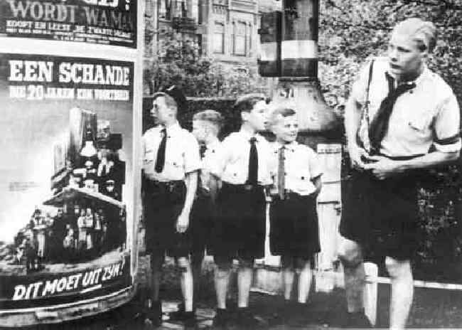 These NJS boys are on an outing. We have no idea where they are headed. Perhaps to the zoo or park or perhaps to a political rally. We just do not know. This looks some what like a Cub outing, except that there is no adult involved, only an older boy as a leader. It s interesting because most available images show the NJS boys lined up in military formations or participating in parades. Here we see a more informal glimpse of the NJS. The photograph is not dated, but we would guess about 1941-42. After the Netherlands was occupied (May 1940) it seemed as though all was lost to many. And as a result some concluded that NAZI rule had to be accepted. We think that as the NAZIs began to experience serious reverses in 1943 they would have more likely to keep their younger sons out of the DJS.