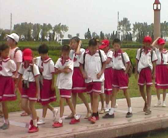 Chinese Pioneers do not have a uniform. Children for Pioneer activities wear their regular clothes or school uniform. The red neckerchief is the only uniform item. They tie it with an overhand knot or a reef knot and use no woggle. It is worn with either long or short trousers and over a white shirt, but a HBC reader has seen many youngsters wearing their scarf over their school uniform or a coloured shirt, apparently as a token of their membership. Once virtually all Chinese children wore their red scarves to school. For many children a red scarfe and white shirt was a formal as the Young Pioneer uniform got. In the 2000s, whole groups of uniformed school children can be seen without the once ubiquitous red scarves.