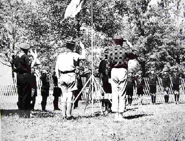 We have only limited information at this time. We do have some black and white photographs. Canadian Cubs in the 1950s had uniforms that look very much like English Cubs. The colors we are less sure about. Some may have been similar were very similar to England as well with the Canadian Cubs wearing green caps and sweaters just like the English Cubs as well. Butbw see other imaoge of the boys wearing dark blie shirts and oanrs like American cubs. Unlike American Cubs the boys wore short pants and kneesocks rather than the long pants that American Cubs usually wore. The photograph here was apparently taken in 1954. Unfortunately wevcan not make out much detail on the boys' uniforms. They seen to be wearing dark colored uniforms, possibly dark blue, caos, shorts, short pants, and knee socks. A close up seems to show they are wearingblighter colored caps and jersey rather than dark shirts.