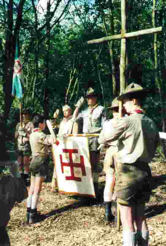 While HBU does not have details on the Riaumont rituals. Some information is available on the cross shown here. The cross on the banner is the cross "potencée". Father SEVIN of the Company of Jesus (Jesuits) who founded Catholic scouting in France choose the potencée cross as symbol for its first experiment Scout troop at the Franco-Belgian border during the World War I (1914-18). The German Army which occupied the area, prohibited scouting. HBU was aware that the Germans banned Scouting in Belgium during World War II, but was not aware that they had also done this during World War I. The boys of Father Sevin during World War I had a potencée cross embroidered in red on a piece of green fabric as a sign of recognition. After World War I in 1920, the potencée cross was selected as a badge by the Catholic Scouts in France. Why did Father Sevin had chosen this cross? He wanted a link between the Souting and the chilvaric orders of French knighthood. The potencée cross was the sign of ancient order of Holy Sepulchre for the knights of Malta. The "potencée" cross is now a fondamental badge for Catholics scouts in France with variation for the Scouts d'Europe which have choosed the actuel cross of Malta with eight acute points.