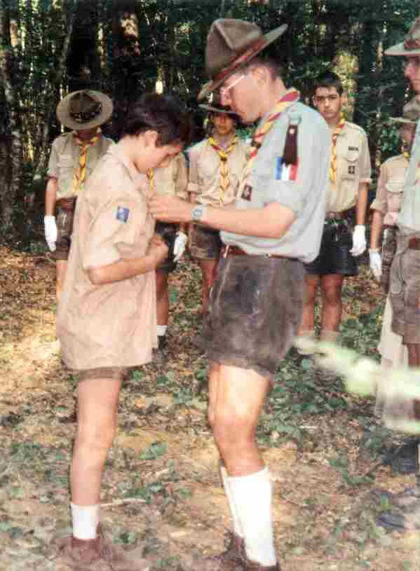 The Riaumont Scouts are a traditional group. As such they take the rityuals and pagentry of Scouting very seriously. Their religious foundation is probably another factor in this emphasis on ritual. There desire to return to some of the pre-Vatican II Church rituals is the primary reason they broke away from the main stream French Scout movement. Some American church based groupsm also with traditional religious beliefs, have withdrawn from the Boy Scouts. They are by law not allowed to refer to themselves as Scouts and instead chose the name of Royal Rangers. The most important ritual for the French Scouts is when a new boy moving up from the Cubs takes the Scout oath or promise.