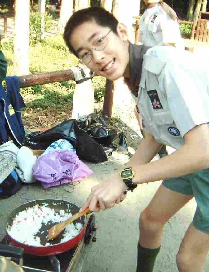 Cooking while camping is an activity persued by Scouts around the world. In Hong Kong it is done in an urban setting. Of course what the Scouts cook varies greatly from country to country. The Hong Kong Scout here is preparing a rice dish (figure 1).
