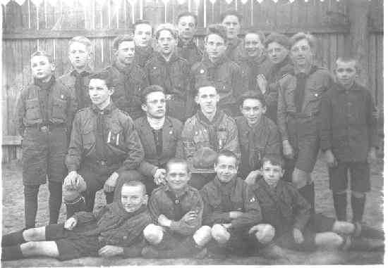 We have very limited information on Latvian Scouting and uniforms. An early photograph of Latvian Scouts shows them wearing very traditional uniforms, little different than early British uniforms. The one unusual aspect of the photograph is that the boy standing on the far left is wearing long over the knee stockings. This is something you rarely see wuth Scouts. We have noted Scouts wearing long pants, short pants and knee socks, or short pants and short socks, but never the long over the knee stockings. Long stockings were extensively worn by German, Polish, and Scandinavian boys so it is likely that some Scouts did wear them. We also notice Latvian Scouts wearing an unusual cap. Other wise the uniform seems quite standard for the time.