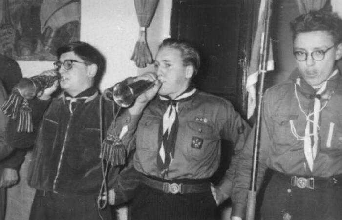 Figure 1.--These Austrian Scouts in 1955 are giving a fanfair at a meeting in 1955. They wear beige or tan shirts and brown pants, I think corduroys. Note the red and white neckerchiefs. Photograph courtesy of the Pfadfinder und Pfadfinderinnen Österreichs. |