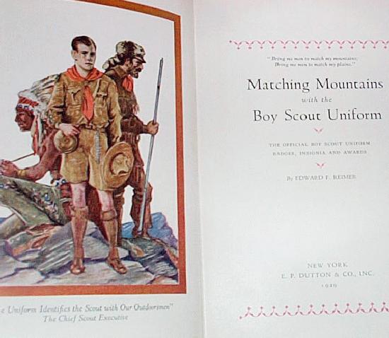 U.S. Boy Scout official Edward F. Reimer published an informative book, Matching Mountains with the Boy Scout Uniform. Edward Reimer was on the National Editorial Staff for the Boy Scouts of America. The title is based upon a poem by Sam Walter Foss. The book is loaded with information about Scouting and the Boy Scout uniform. As stated on the inside dust jacket flap, "This beautiful Book was the only work on the Uniform authorized by the Boy Scouts of America". This book is loaded with over a 100+ Photos and Color Illustrations. It Measures 5 ¾ in x 8 ¼ in and has over 190 pages. It was published by E. P. Dutton & Co., Inc in New York City during 1929.