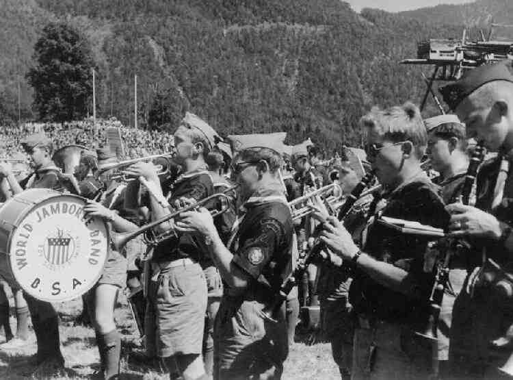 Various groups at the Jamboree organized entertainments. We note the American Scout band giving a concert. Scout bands seem popular in America through the 1950s, but we see less of them by the 1960s. I'm not sure how a Scout Band was formed for the World Jamboree. The drum suggests that the BSA provided at least some instruments. They probably then queried the boys who signed up for the Jamboree to find musicians. A trip to Europe for American Scouts was a major and very expensive undertaking in 1951. Most of the U.S. Scouts were older boys. The dark green shirts here indicate that they were Explorers.