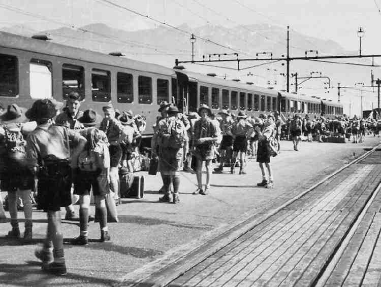 each of the mountains surrounding the site. All in all it was a tremendous achievement by a country still under military occupation. A Swiss Scout remembers attending the 7th World Jamboree. A large contingent of Swiss Scots traveled to Bad Ischl by train. One of the interesting aspects of the World Jamborees was comparing each others' uniforms. Scouts also brought along folk and other traditional clothing which they would also wear. We note Swiss Scouts showing off traditional garments. Swiss Scouts also brought included a group of Scouts with handicaps, the fitst contingent to do so. Various groups at the Jamboree organized entertainments. We note the American Scout band giving a concert. Scout bands eem popular in America through the 1950s, but we see less of them by the 1960s. The 1951 World Jamboree was renownd for its very elaborate pioneering-projects built by the Scouts. Here is one of the great pioneering projects which were built by the Scouts. I think modern Scout Leaders might not allow constructions like this for safty reasons.
