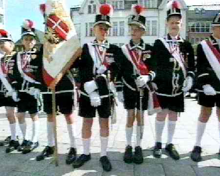 This German group was identified on television as Edelknabenfeldwebel. "Knaben" means "boys". We thought that at first the boys were dressed for a pagent, but have since learned that they belong to Edelknaben or shooting clubs. These German boys wear an elaborate uniform with some 19th century elements. There are some variations in uniforms among the various clubs. We are not sure why this uniform was selected, it may be due to the time in which some of the eraly clubs were organized. The group is a shooting club called Edelknaben. These clubs exist all over Germany, but are most common in Western Germany.