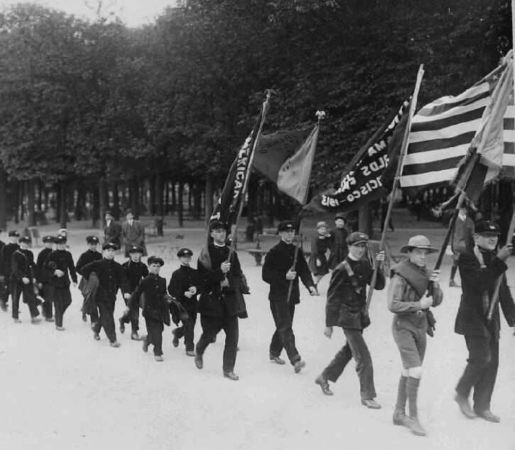 The photograpghs of the visiting American group are undated, but we know that they were taken during or after 1913 because some of the boys are carrying the 48-star American flag. The photograph could have been taken during the 1910s, but the early 20s is possible. One of the images show the boys with a flag that seems to show the date "1913" (figure 1). It also seems to read "World's Fair". That might suggest that the boy are coming to Paris for the World's Fair. The only problem here is that there was no World's Fair in Paris during 1913. Also we seem to read "Franciso" onthe flag. And there was a a World's Fair in San Francisco during 1915 so what looks like 1913 is probably 1915. That does not netecarily mean that the photograph was taken in 1915. Perhaps they were just proclaiming that they visited the World's Fair. But the most likely interpretation, I think. is that the boys were from San Francisco and advertising the World's Fair. This the photograph was probably taken in 1915 during World War I. Given that the boys are camping and they probably would not have gone during the school year, one might guess that it is July or August. The way the French are dressed, however it does not look like summer. We even see French boys in their school smocks. Another possibility is that the group here was in Paris because they attended the 1920 Jamboree in Paris. In fact one of the La Journal ohotograph is dated 1920, although we are not sure it is connected to the other photographs. The fact that this photograph is dated and the immense notriety of the German U-boat sinking leads us to conclude that all of the images here were taken in 1920 and the boys part of the american Scout delegation to the Jaboree in London. I think that American mothers at the time would have been agast at the idea of sending their sons into U-boat infested waters, wether or not the Germans had suspended unrestricted sunmarine warfare.